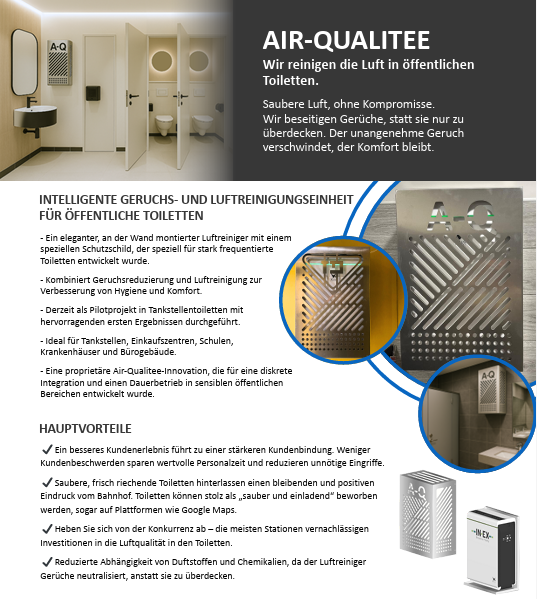 Schlechte Luft wird selten technisch beschrieben. Sie wird erlebt. Gerüche, VOCs, Feinstaub, Viren, Bakterien und andere luftgetragene Belastungen beeinflussen, ob ein Raum als sauber, angenehm und vertrauenswürdig wahrgenommen wird. Besonders sensibel sind Bereiche mit hoher Frequenz: Stores. ✔️ Sanitäranlagen. ✔️Tankstellenshops. ✔️Restaurants. ✔️Bürogebäude. ✔️Kliniken. ✔️Pflegebereiche. ✔️Agrarbetriebe. ✔️ Einkaufszentren ✔️ Messe- und Veranstaltungshallen